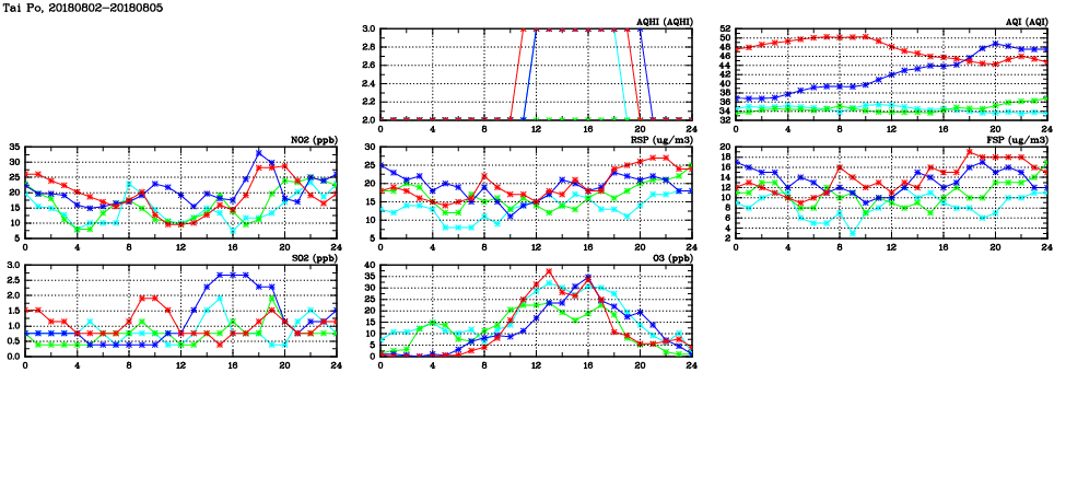 | Air Quality Data Time Series in Tai Po (2018/08/05) | ( Line colors: Day -3 Day -2 Day -1 Current day ) | 2D Map Current AQHI |
