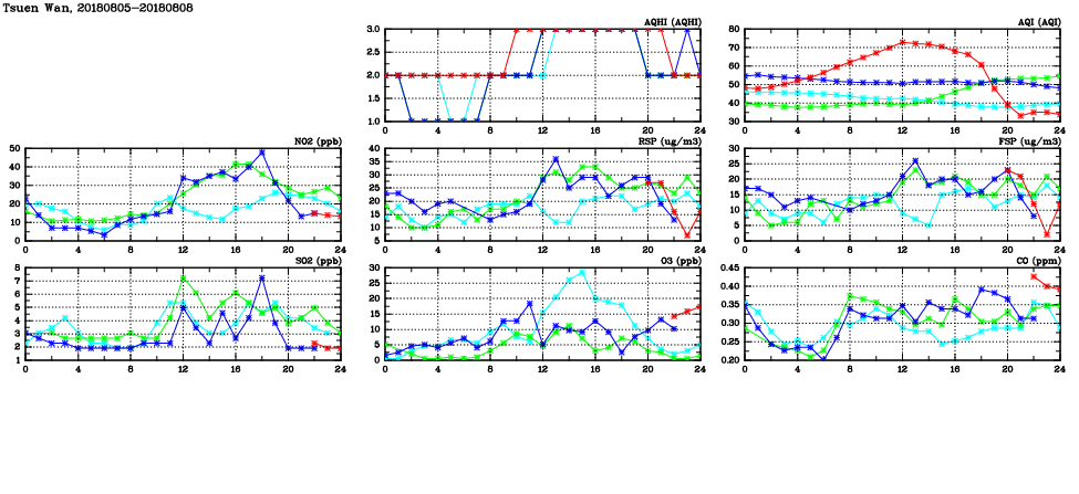 | Air Quality Data Time Series in Tsuen Wan (2018/08/08) | ( Line colors: Day -3 Day -2 Day -1 Current day ) | 2D Map Current AQHI |