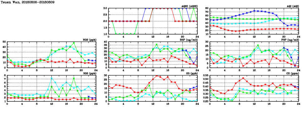 | Air Quality Data Time Series in Tsuen Wan (2018/08/09) | ( Line colors: Day -3 Day -2 Day -1 Current day ) | 2D Map Current AQHI |