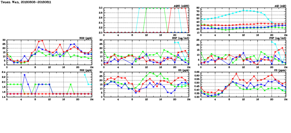 | Air Quality Data Time Series in Tsuen Wan (2018/08/11) | ( Line colors: Day -3 Day -2 Day -1 Current day ) | 2D Map Current AQHI |