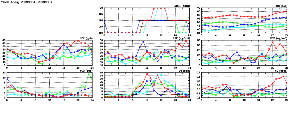 | Air Quality Data Time Series in Yuen Long (2018/08/07) | ( Line colors: Day -3 Day -2 Day -1 Current day ) | 2D Map Current AQHI |