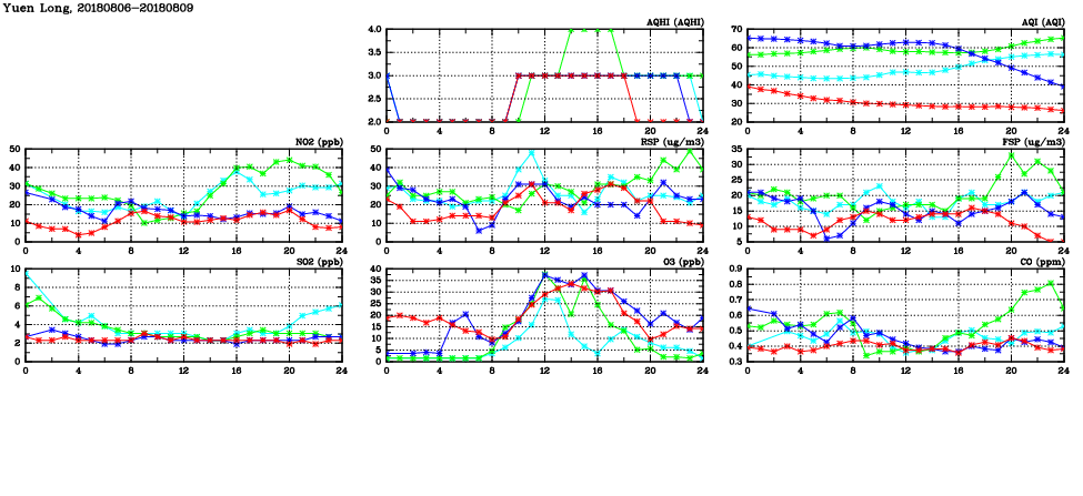 | Air Quality Data Time Series in Yuen Long (2018/08/09) | ( Line colors: Day -3 Day -2 Day -1 Current day ) | 2D Map Current AQHI |