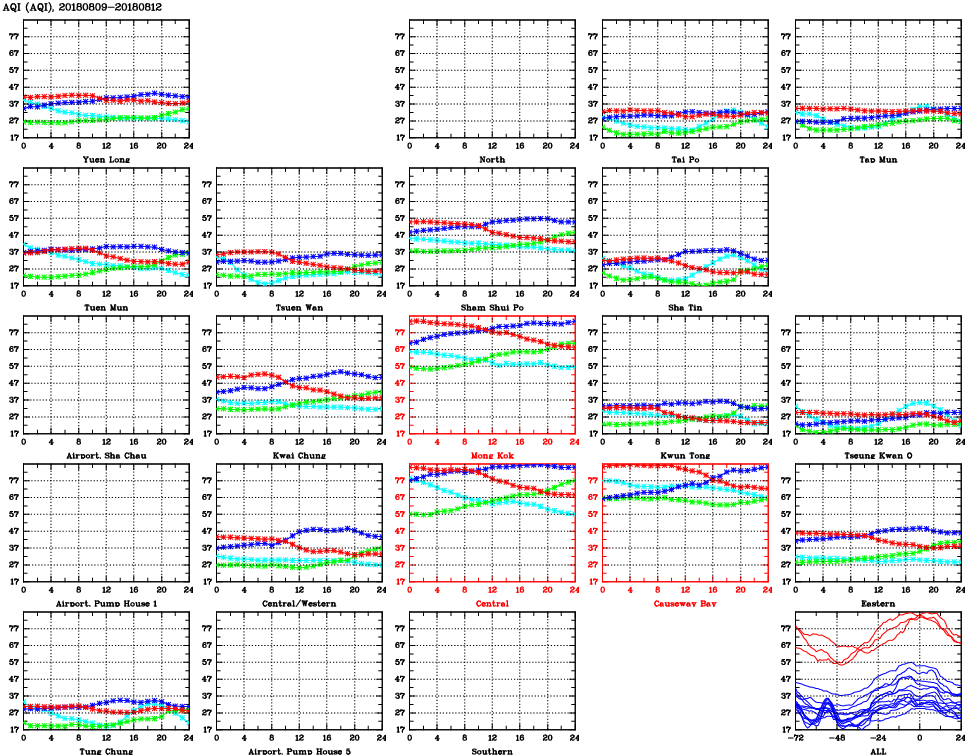 | Air Quality Data Time Series for AQI (2018/08/12) | ( Line colors: Day -3 Day -2 Day -1 Current day ) | 2D Map Current AQHI |