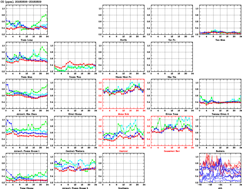 | Air Quality Data Time Series for CO (2018/08/09) | ( Line colors: Day -3 Day -2 Day -1 Current day ) | 2D Map Current AQHI |