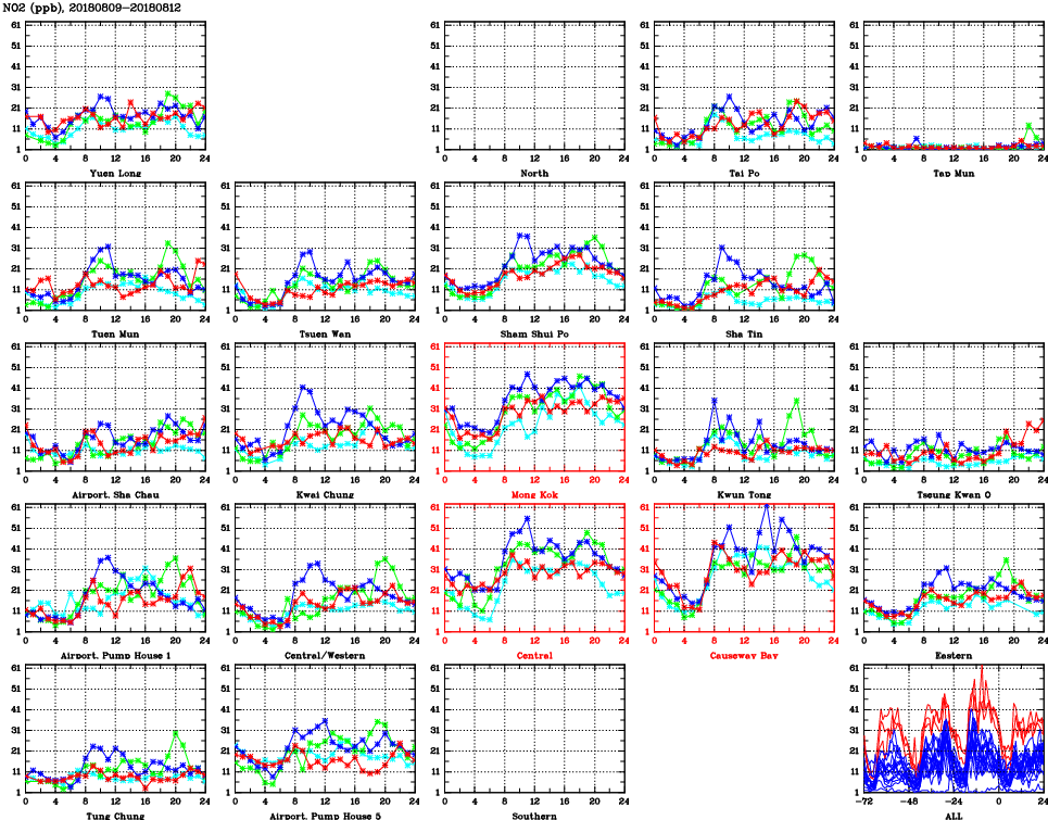 | Air Quality Data Time Series for NO2 (2018/08/12) | ( Line colors: Day -3 Day -2 Day -1 Current day ) | 2D Map Current AQHI |