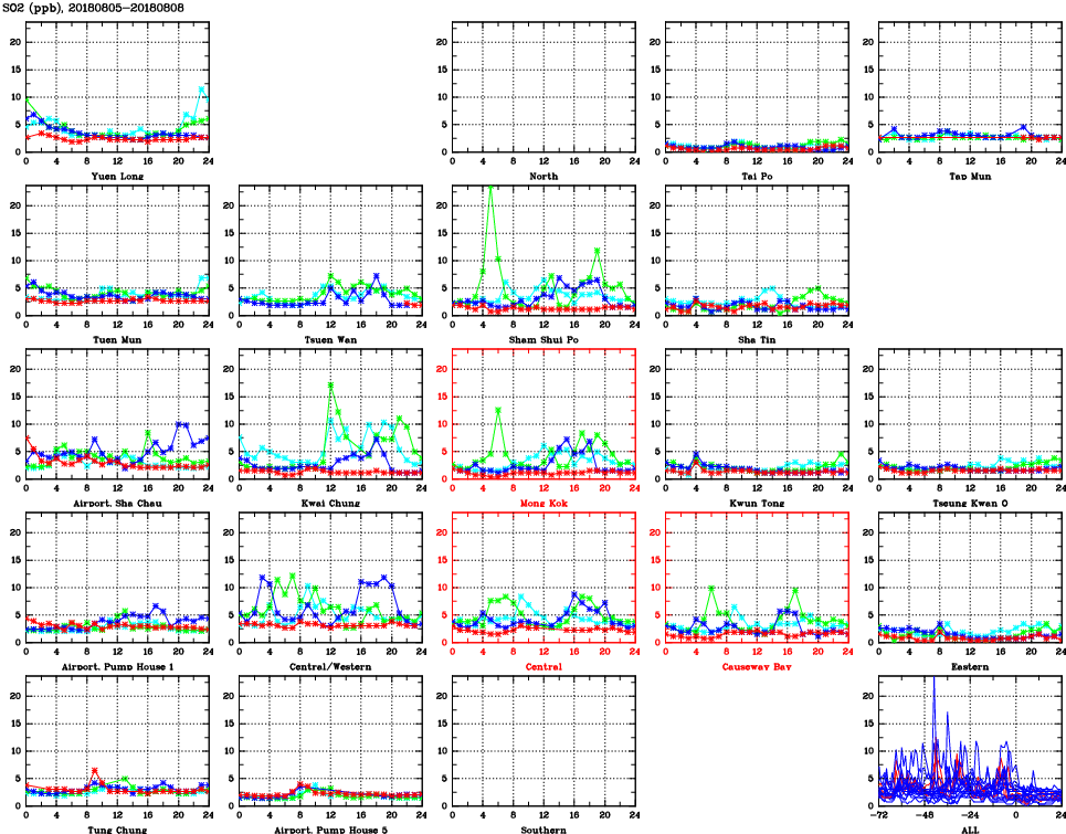 | Air Quality Data Time Series for SO2 (2018/08/08) | ( Line colors: Day -3 Day -2 Day -1 Current day ) | 2D Map Current AQHI |