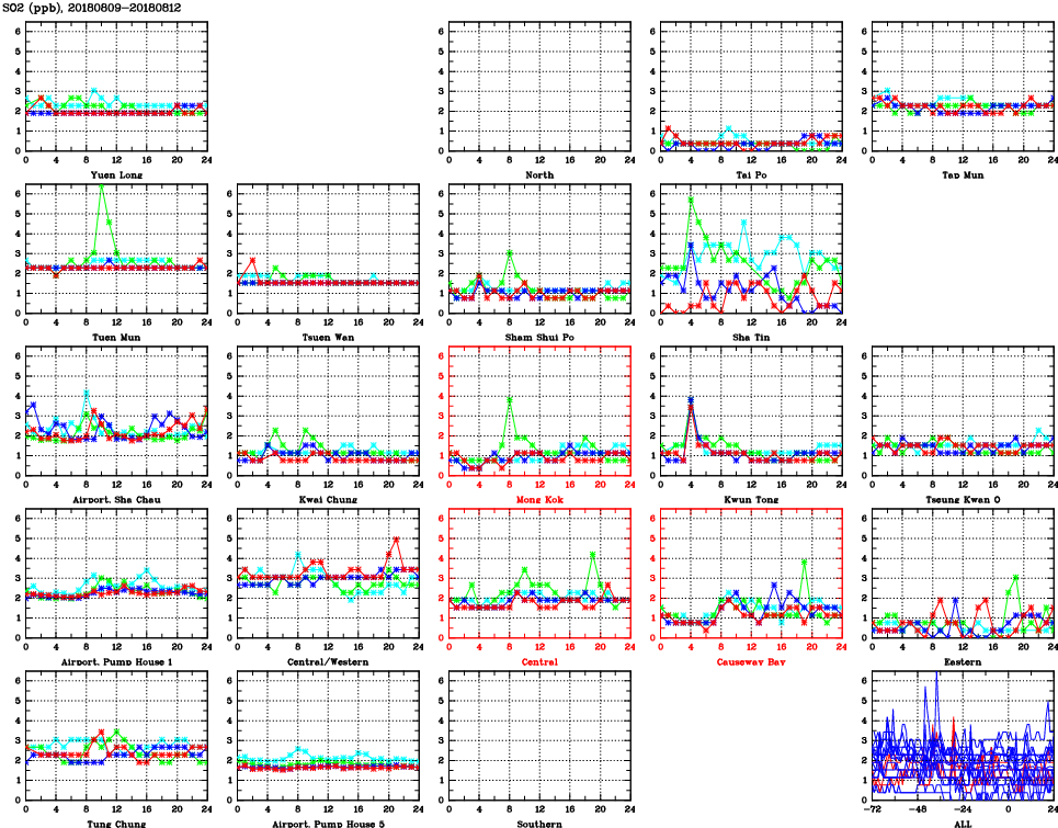 | Air Quality Data Time Series for SO2 (2018/08/12) | ( Line colors: Day -3 Day -2 Day -1 Current day ) | 2D Map Current AQHI |