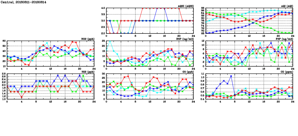 | Air Quality Data Time Series in Central (2018/08/14) | ( Line colors: Day -3 Day -2 Day -1 Current day ) | 2D Map Current AQHI |