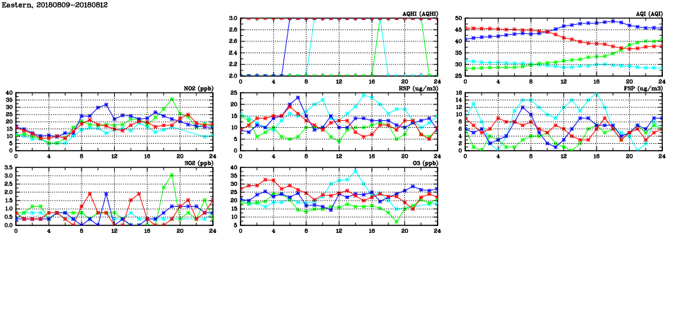| Air Quality Data Time Series in Eastern (2018/08/12) | ( Line colors: Day -3 Day -2 Day -1 Current day ) | 2D Map Current AQHI |