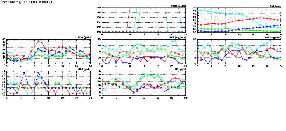 | Air Quality Data Time Series in Kwai Chung (2018/08/11) | ( Line colors: Day -3 Day -2 Day -1 Current day ) | 2D Map Current AQHI |