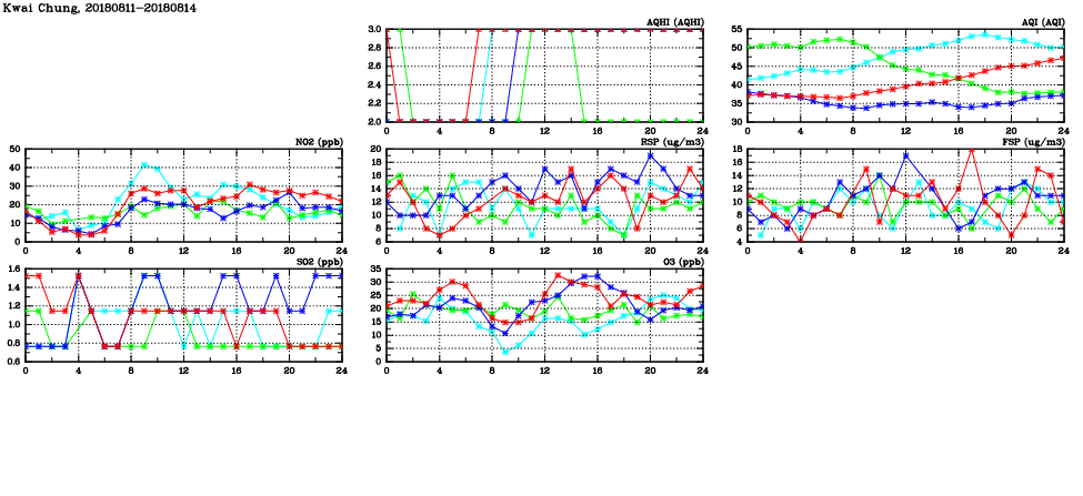| Air Quality Data Time Series in Kwai Chung (2018/08/14) | ( Line colors: Day -3 Day -2 Day -1 Current day ) | 2D Map Current AQHI |