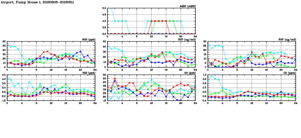 | Air Quality Data Time Series in Airport, Pump House 1 (2018/08/11) | ( Line colors: Day -3 Day -2 Day -1 Current day ) | 2D Map Current AQHI |