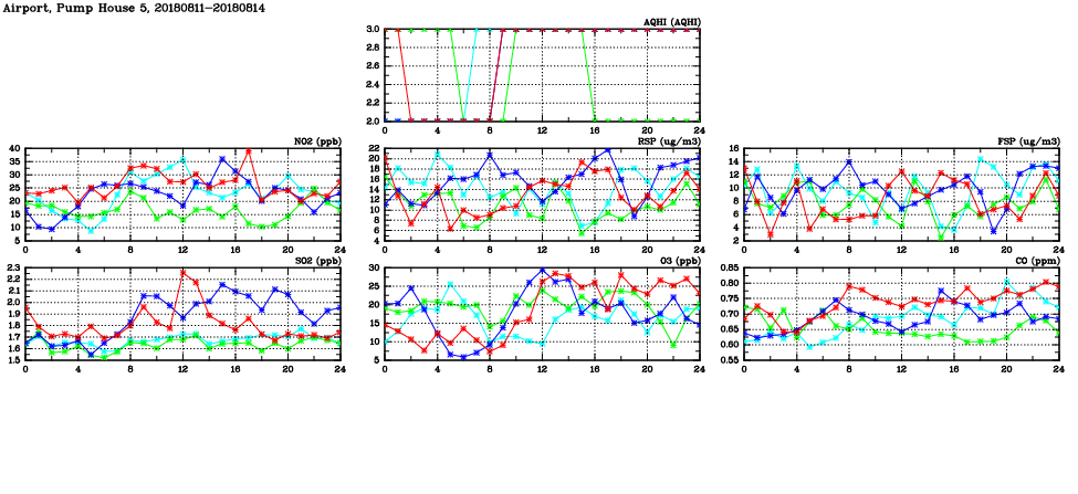 | Air Quality Data Time Series in Airport, Pump House 5 (2018/08/14) | ( Line colors: Day -3 Day -2 Day -1 Current day ) | 2D Map Current AQHI |