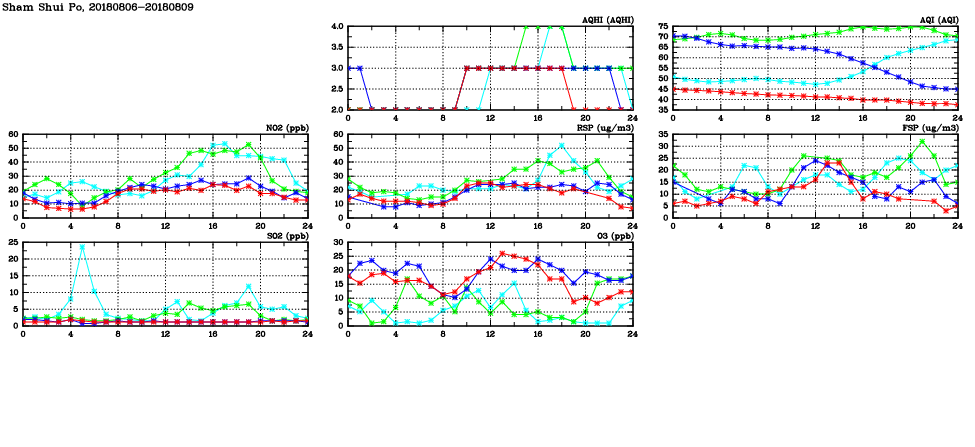 | Air Quality Data Time Series in Sham Shui Po (2018/08/09) | ( Line colors: Day -3 Day -2 Day -1 Current day ) | 2D Map Current AQHI |