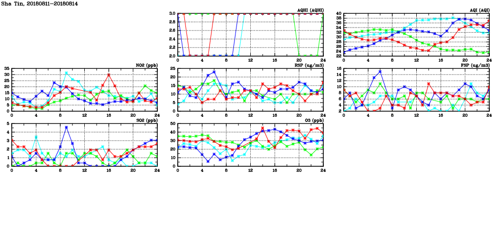 | Air Quality Data Time Series in Sha Tin (2018/08/14) | ( Line colors: Day -3 Day -2 Day -1 Current day ) | 2D Map Current AQHI |