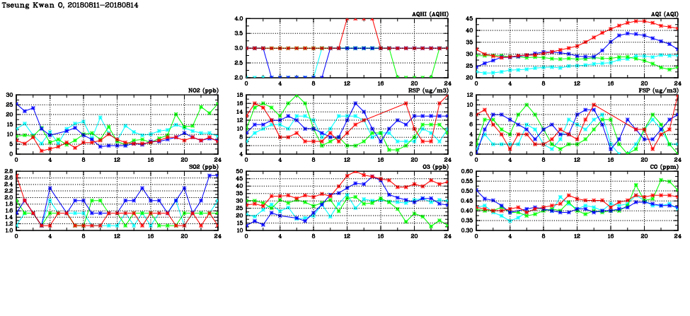 | Air Quality Data Time Series in Tseung Kwan O (2018/08/14) | ( Line colors: Day -3 Day -2 Day -1 Current day ) | 2D Map Current AQHI |