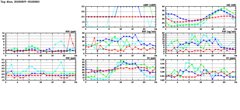 | Air Quality Data Time Series in Tap Mun (2018/08/10) | ( Line colors: Day -3 Day -2 Day -1 Current day ) | 2D Map Current AQHI |