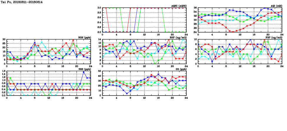 | Air Quality Data Time Series in Tai Po (2018/08/14) | ( Line colors: Day -3 Day -2 Day -1 Current day ) | 2D Map Current AQHI |