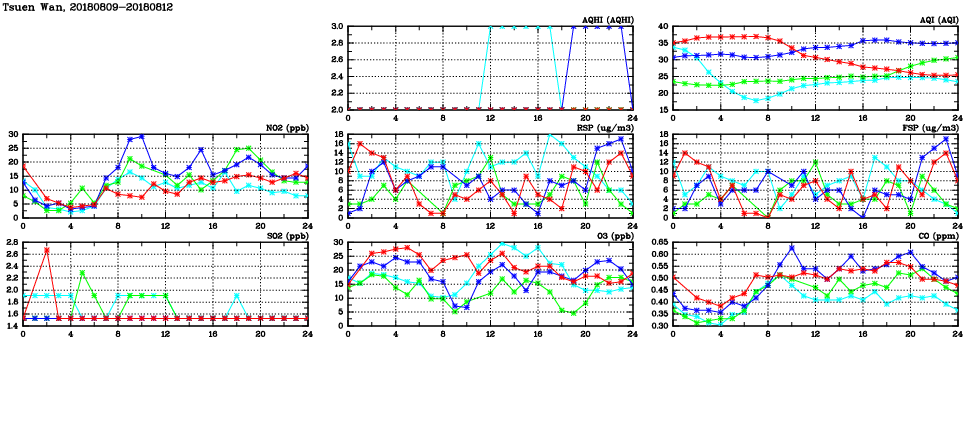 | Air Quality Data Time Series in Tsuen Wan (2018/08/12) | ( Line colors: Day -3 Day -2 Day -1 Current day ) | 2D Map Current AQHI |