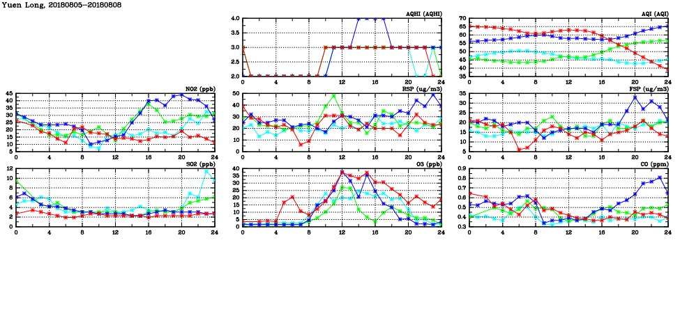 | Air Quality Data Time Series in Yuen Long (2018/08/08) | ( Line colors: Day -3 Day -2 Day -1 Current day ) | 2D Map Current AQHI |