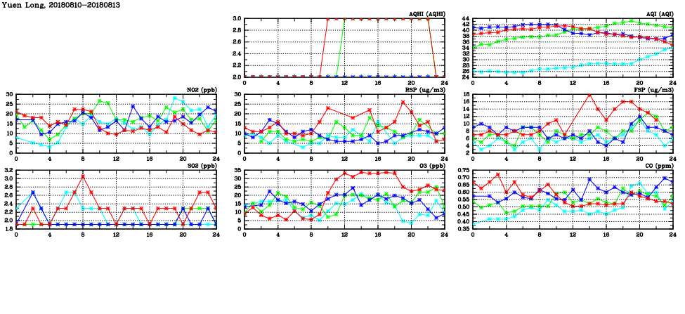 | Air Quality Data Time Series in Yuen Long (2018/08/13) | ( Line colors: Day -3 Day -2 Day -1 Current day ) | 2D Map Current AQHI |
