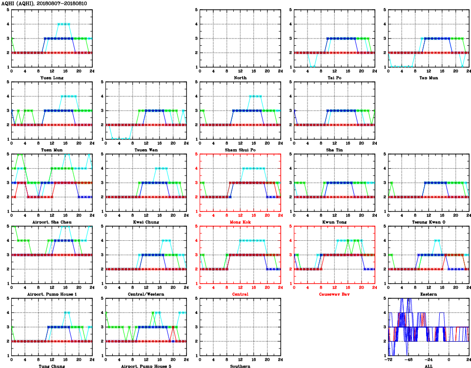 | Air Quality Data Time Series for AQHI (2018/08/10) | ( Line colors: Day -3 Day -2 Day -1 Current day ) | 2D Map Current AQHI |