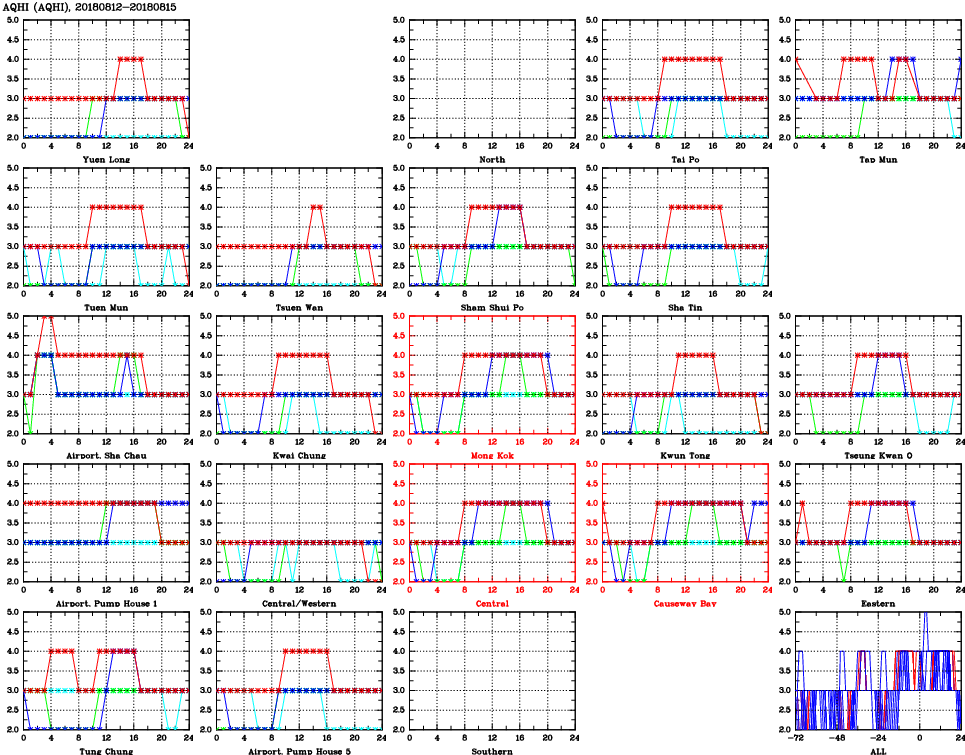 | Air Quality Data Time Series for AQHI (2018/08/15) | ( Line colors: Day -3 Day -2 Day -1 Current day ) | 2D Map Current AQHI |