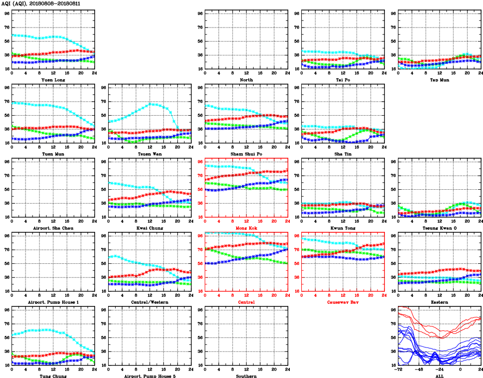 | Air Quality Data Time Series for AQI (2018/08/11) | ( Line colors: Day -3 Day -2 Day -1 Current day ) | 2D Map Current AQHI |