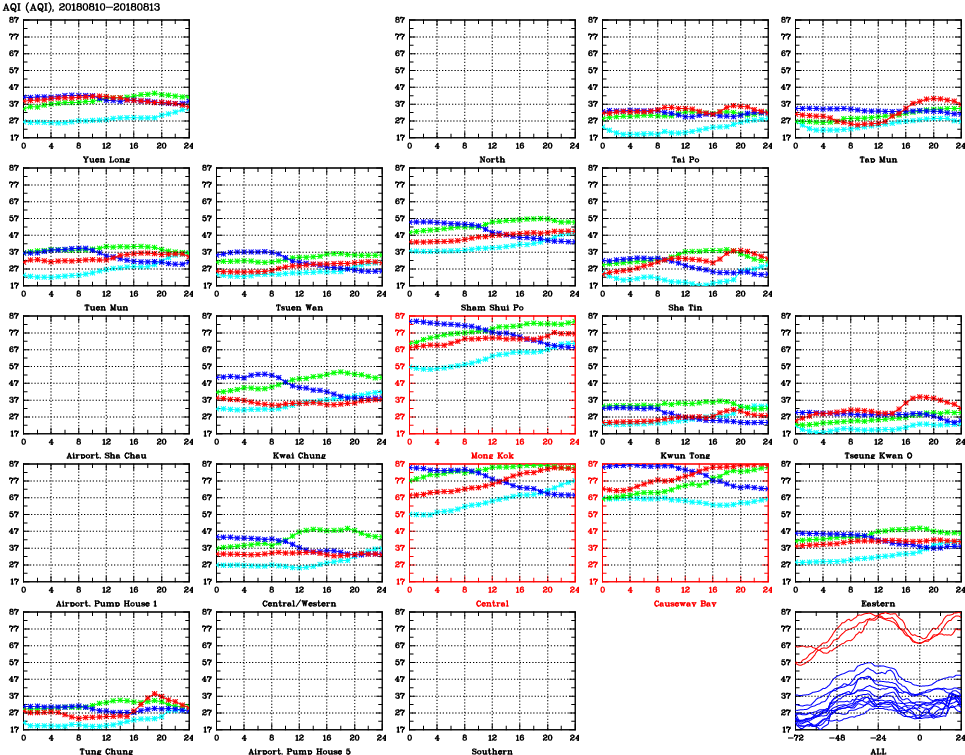 | Air Quality Data Time Series for AQI (2018/08/13) | ( Line colors: Day -3 Day -2 Day -1 Current day ) | 2D Map Current AQHI |