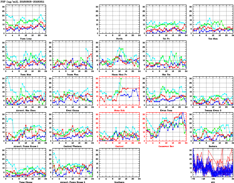 | Air Quality Data Time Series for FSP (2018/08/11) | ( Line colors: Day -3 Day -2 Day -1 Current day ) | 2D Map Current AQHI |