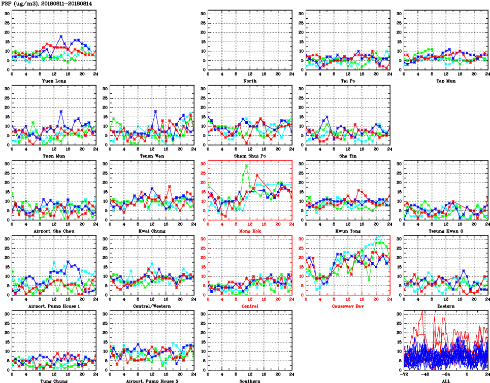 | Air Quality Data Time Series for FSP (2018/08/14) | ( Line colors: Day -3 Day -2 Day -1 Current day ) | 2D Map Current AQHI |