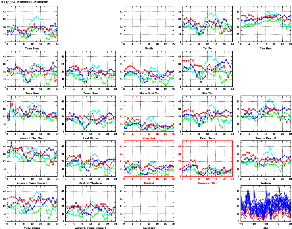 | Air Quality Data Time Series for O3 (2018/08/12) | ( Line colors: Day -3 Day -2 Day -1 Current day ) | 2D Map Current AQHI |