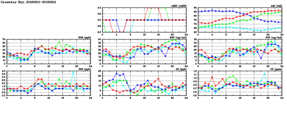 | Air Quality Data Time Series in Causeway Bay (2018/08/13) | ( Line colors: Day -3 Day -2 Day -1 Current day ) | 2D Map Current AQHI |