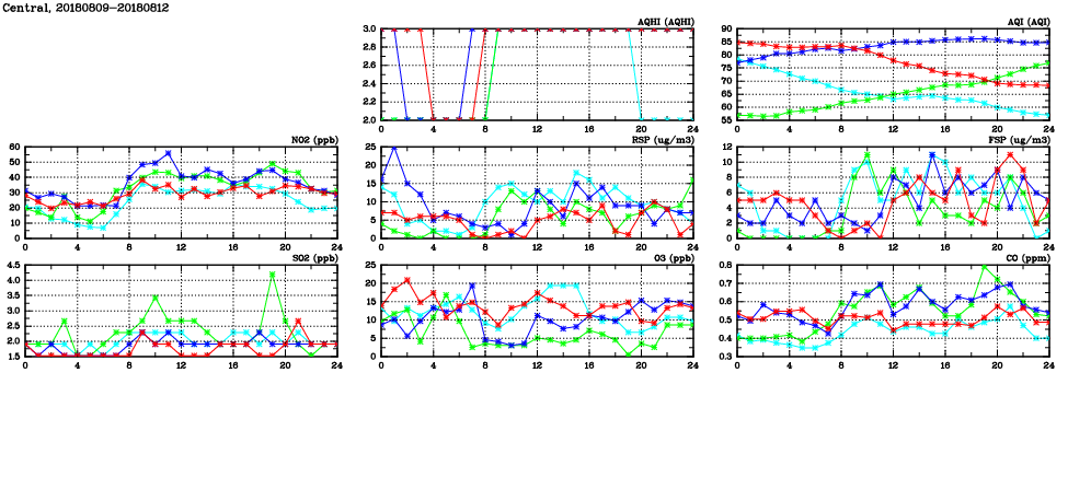 | Air Quality Data Time Series in Central (2018/08/12) | ( Line colors: Day -3 Day -2 Day -1 Current day ) | 2D Map Current AQHI |