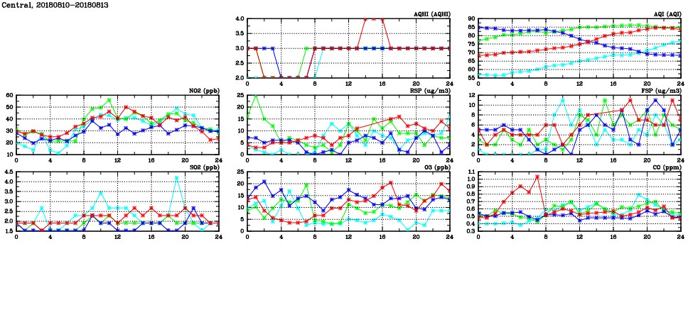 | Air Quality Data Time Series in Central (2018/08/13) | ( Line colors: Day -3 Day -2 Day -1 Current day ) | 2D Map Current AQHI |