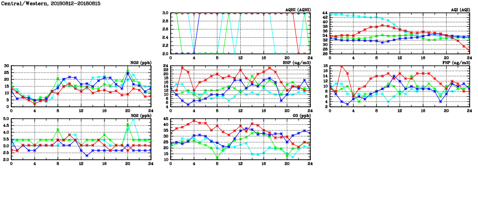 | Air Quality Data Time Series in Central/Western (2018/08/15) | ( Line colors: Day -3 Day -2 Day -1 Current day ) | 2D Map Current AQHI |