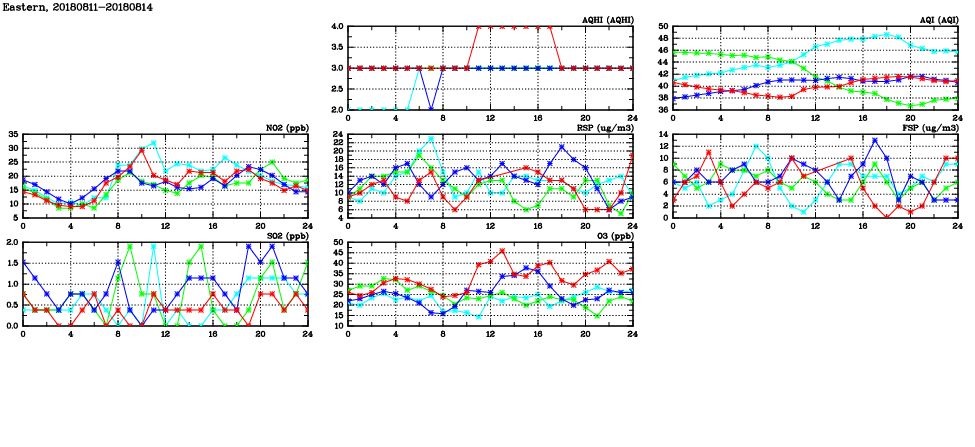 | Air Quality Data Time Series in Eastern (2018/08/14) | ( Line colors: Day -3 Day -2 Day -1 Current day ) | 2D Map Current AQHI |