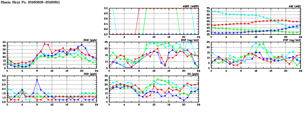 | Air Quality Data Time Series in Sham Shui Po (2018/08/11) | ( Line colors: Day -3 Day -2 Day -1 Current day ) | 2D Map Current AQHI |