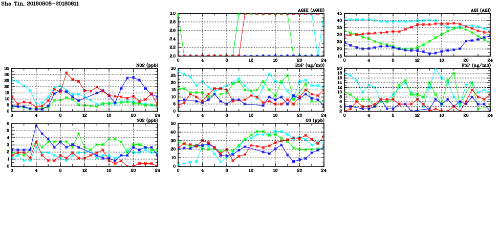 | Air Quality Data Time Series in Sha Tin (2018/08/11) | ( Line colors: Day -3 Day -2 Day -1 Current day ) | 2D Map Current AQHI |