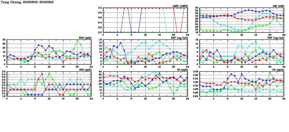 | Air Quality Data Time Series in Tung Chung (2018/08/12) | ( Line colors: Day -3 Day -2 Day -1 Current day ) | 2D Map Current AQHI |
