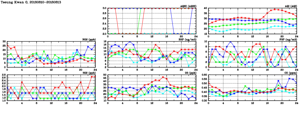 | Air Quality Data Time Series in Tseung Kwan O (2018/08/13) | ( Line colors: Day -3 Day -2 Day -1 Current day ) | 2D Map Current AQHI |