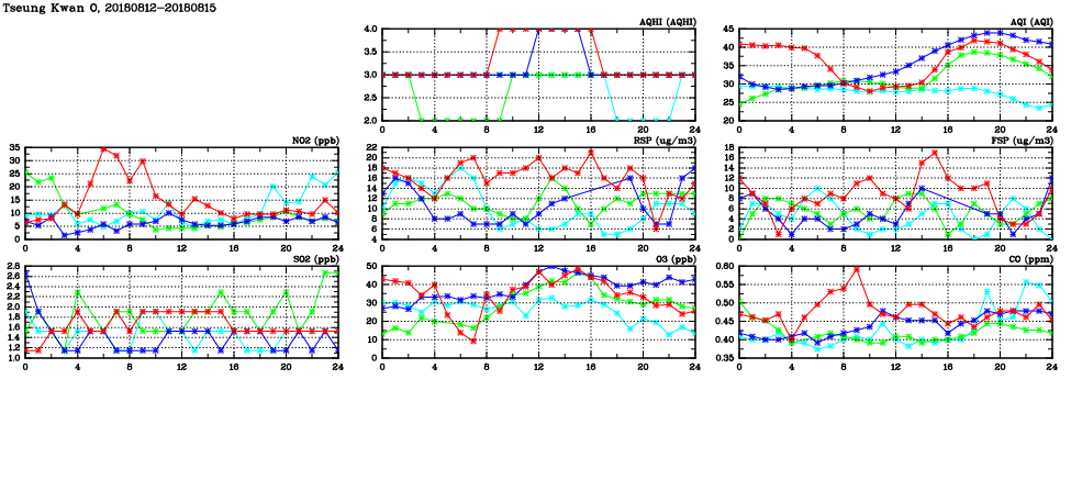 | Air Quality Data Time Series in Tseung Kwan O (2018/08/15) | ( Line colors: Day -3 Day -2 Day -1 Current day ) | 2D Map Current AQHI |