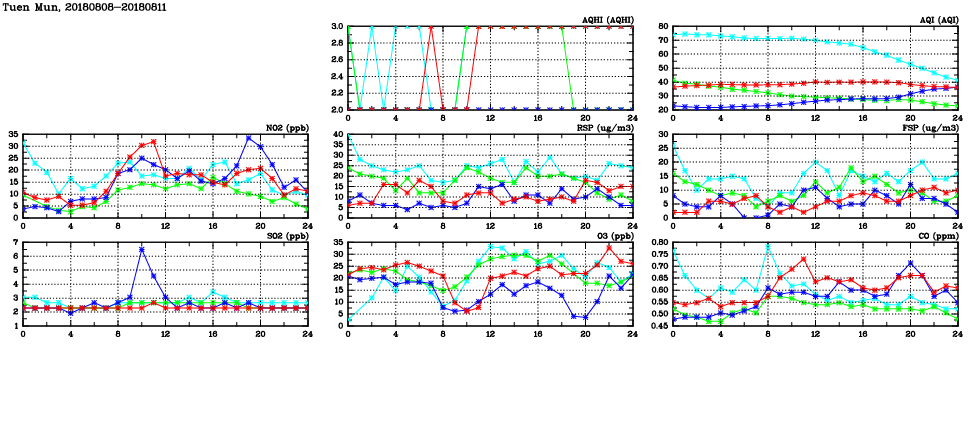 | Air Quality Data Time Series in Tuen Mun (2018/08/11) | ( Line colors: Day -3 Day -2 Day -1 Current day ) | 2D Map Current AQHI |
