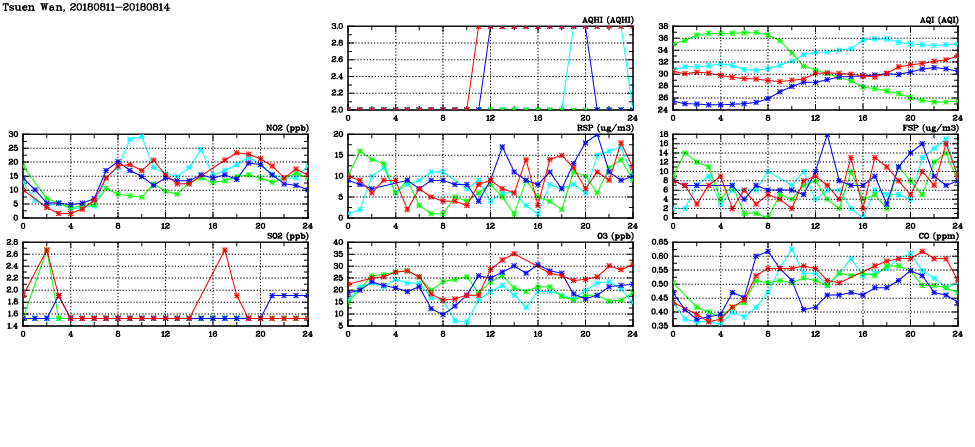 | Air Quality Data Time Series in Tsuen Wan (2018/08/14) | ( Line colors: Day -3 Day -2 Day -1 Current day ) | 2D Map Current AQHI |