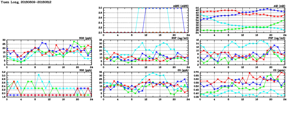 | Air Quality Data Time Series in Yuen Long (2018/08/12) | ( Line colors: Day -3 Day -2 Day -1 Current day ) | 2D Map Current AQHI |