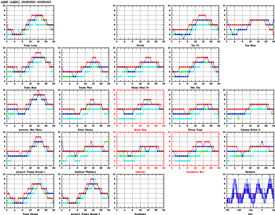 | Air Quality Data Time Series for AQHI (2018/10/03) | ( Line colors: Day -3 Day -2 Day -1 Current day ) | 2D Map Current AQHI |
