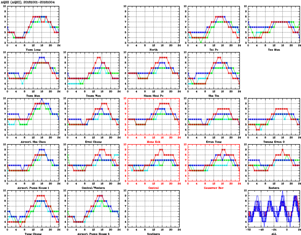 | Air Quality Data Time Series for AQHI (2018/10/04) | ( Line colors: Day -3 Day -2 Day -1 Current day ) | 2D Map Current AQHI |