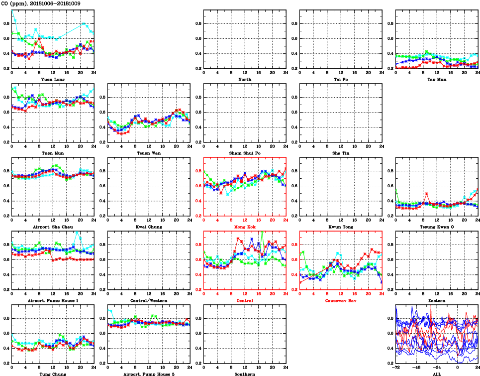 | Air Quality Data Time Series for CO (2018/10/09) | ( Line colors: Day -3 Day -2 Day -1 Current day ) | 2D Map Current AQHI |