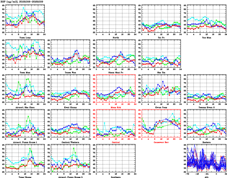| Air Quality Data Time Series for RSP (2018/10/09) | ( Line colors: Day -3 Day -2 Day -1 Current day ) | 2D Map Current AQHI |