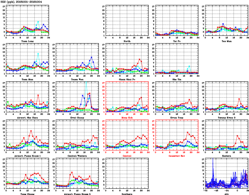| Air Quality Data Time Series for SO2 (2018/10/04) | ( Line colors: Day -3 Day -2 Day -1 Current day ) | 2D Map Current AQHI |